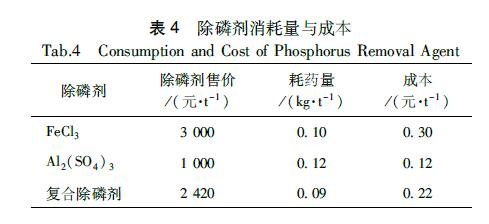 按照處理TP為5mg/L的生活廢水達(dá)到地表水IV類標(biāo)準(zhǔn)計(jì),需消耗除磷劑量與成本估算如表4所示。