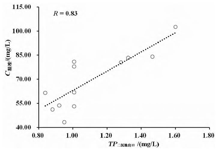 (2)通過TP二沉池出口推測C精準(zhǔn),其兩者線性回歸方程為C精準(zhǔn)=59.833TP二沉池出口+3.2527(γ=0.83),并通過檢驗(yàn)兩者線性顯著相關(guān)(P<0.01)。